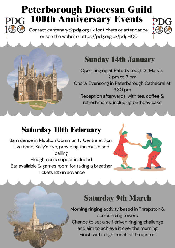 Guild 100th Anniversary event Sunday 14th January Peterborough St Mary’s Ringing 2:00 to 3:00, Evensong 3:30, reception afterwards.