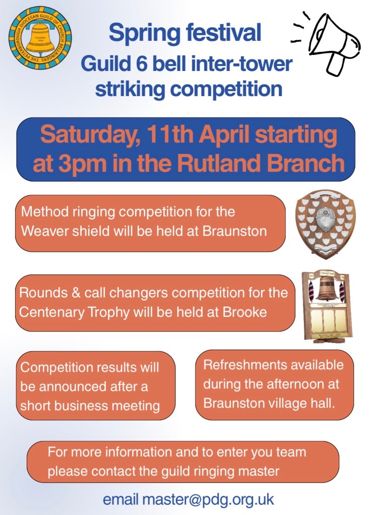 The Spring festival six bell striking competition will be held in the Rutland branch on Saturday 11th April starting from 3pm.