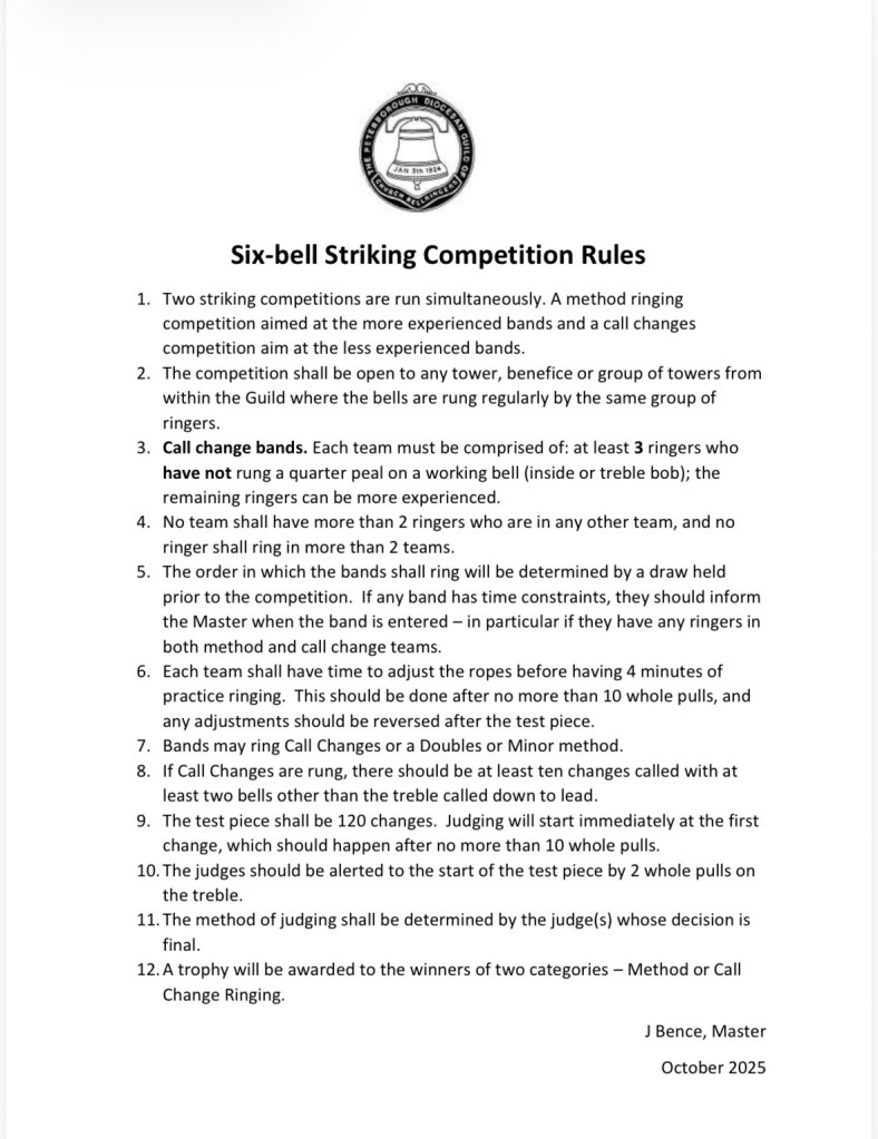 Please find attached a poster, a set of the guild six bell striking competition rules and the note below from our Ringing Master Jim Bence.