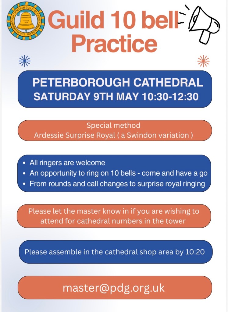 The next Guild 10 bell practice is on Saturday 9th May at Peterborough Cathedral between 10:30-12:30.